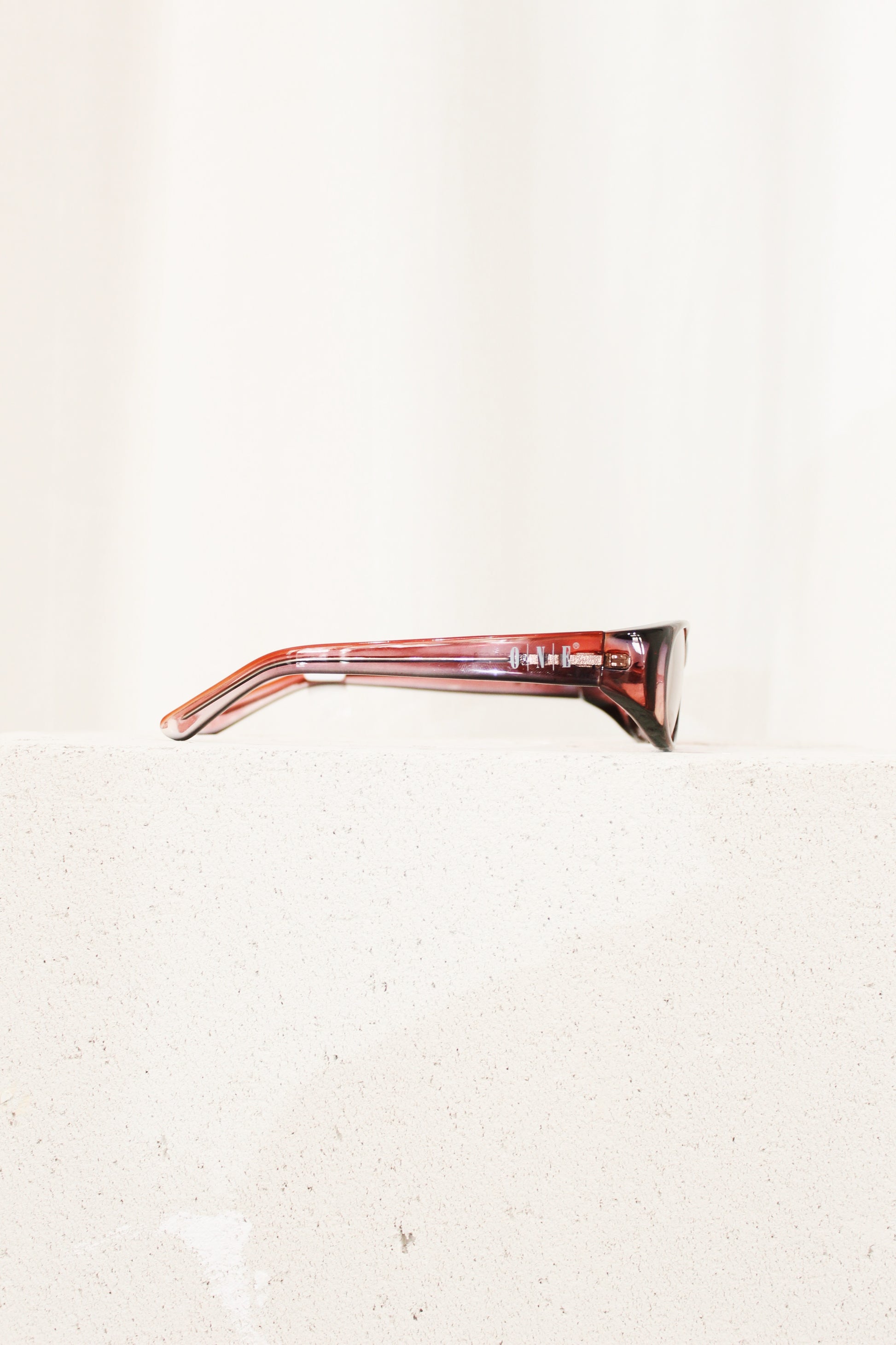 These 1990's style sunglasses from Greek brand ONE showcase a cat-eye inspired design with a striking red acetate frame. Equipped with UV400 protection lenses, they ensure reliable defense against harmful sunlight. Preserved in flawless vintage condition, these sunglasses blend timeless elegance with superior craftsmanship for a distinctive accessory.