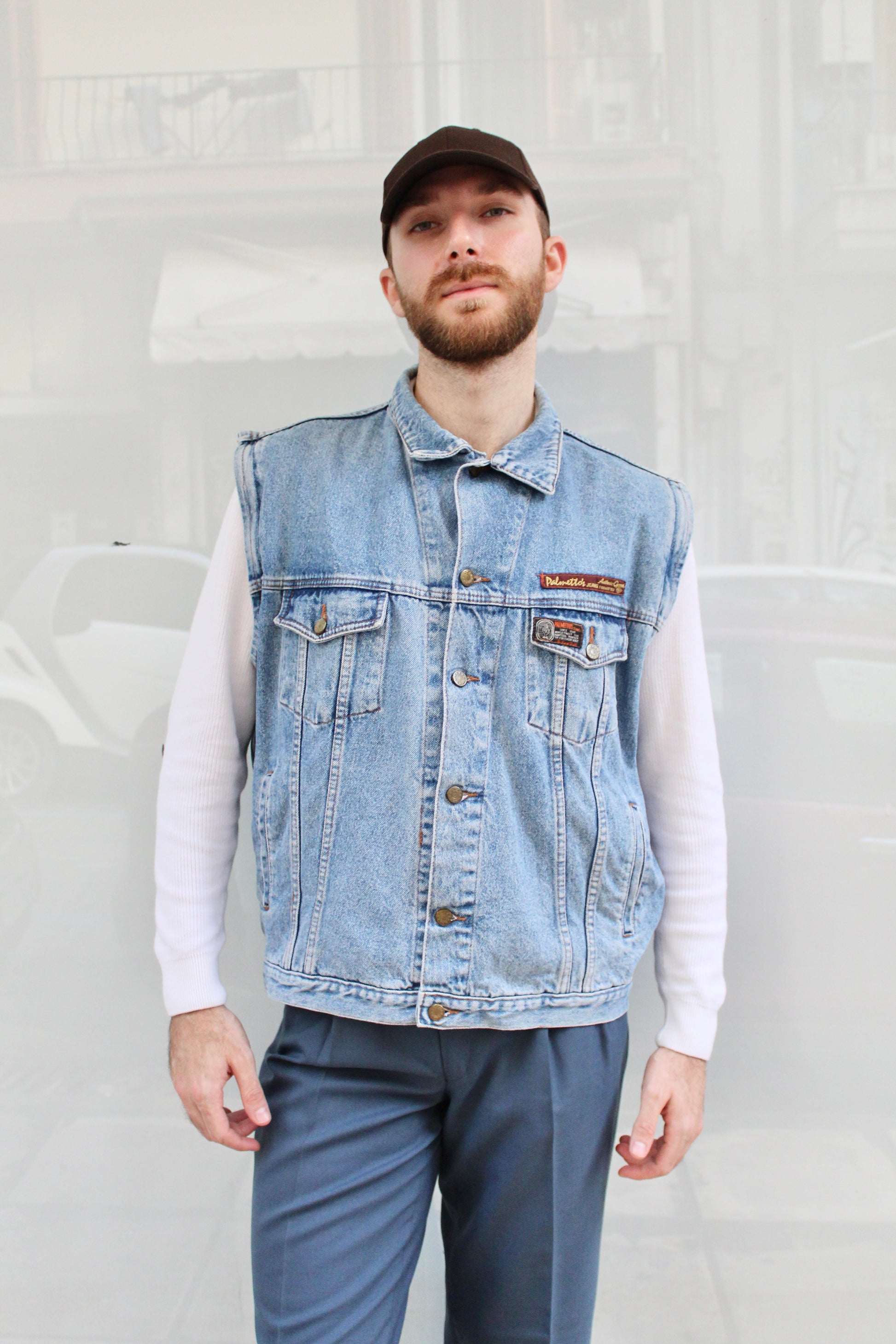 Γιλέκο 90's κλασική γραμμή.Denim μπλέ χρωματισμός. Κατασκευασμένο 100% βαμβάκι. Πολλαπλές τσέπες εξωτερικά.