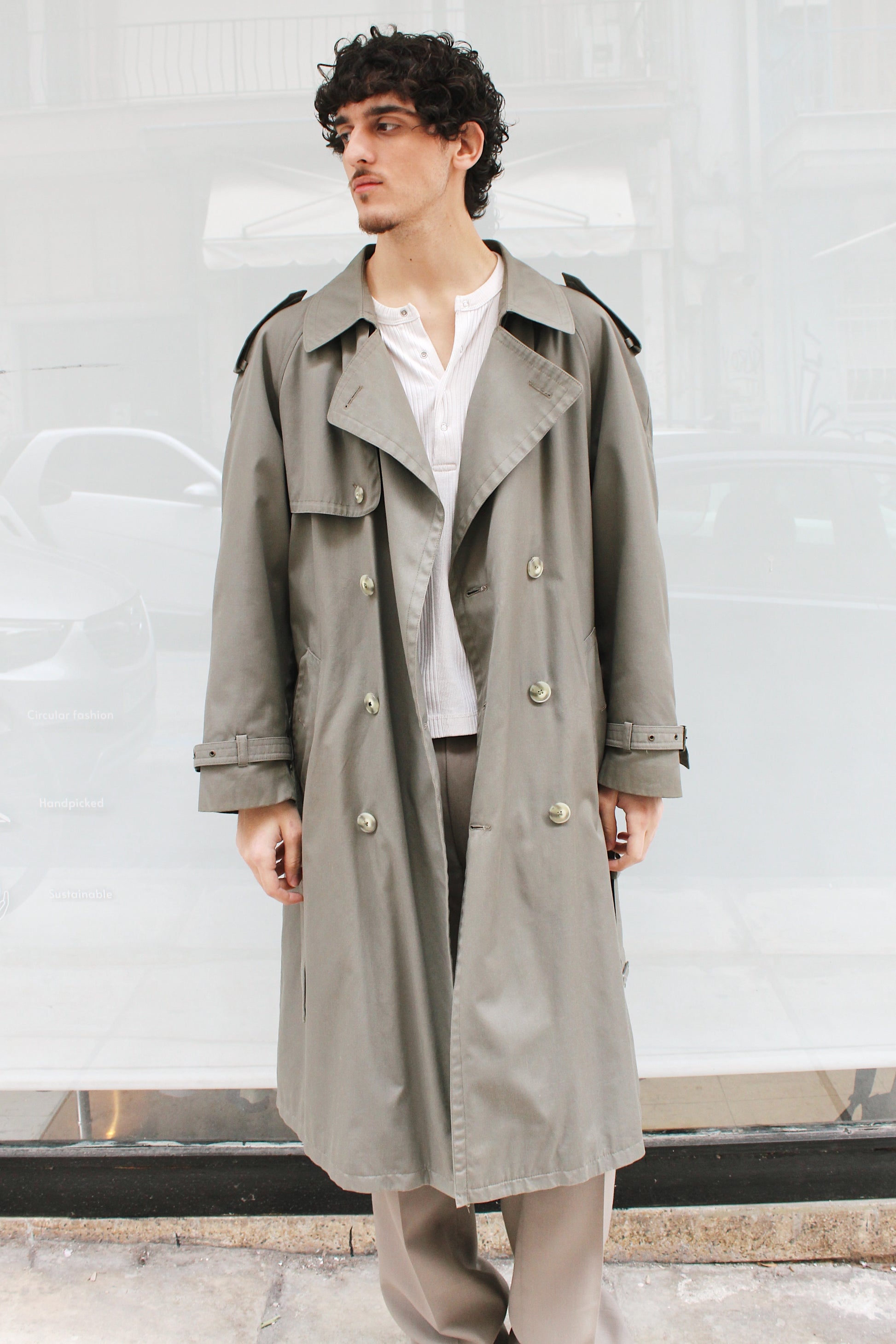 Khaki trench coat. Μεγάλος γιακάς. Διπλό κούμπομα. Εσωτερικές και εξωτερικές τσέπες. Εσωτερική μάλλινη αποσπώμενη επένδυση. Ζώνη περιμετρικά της μέσης