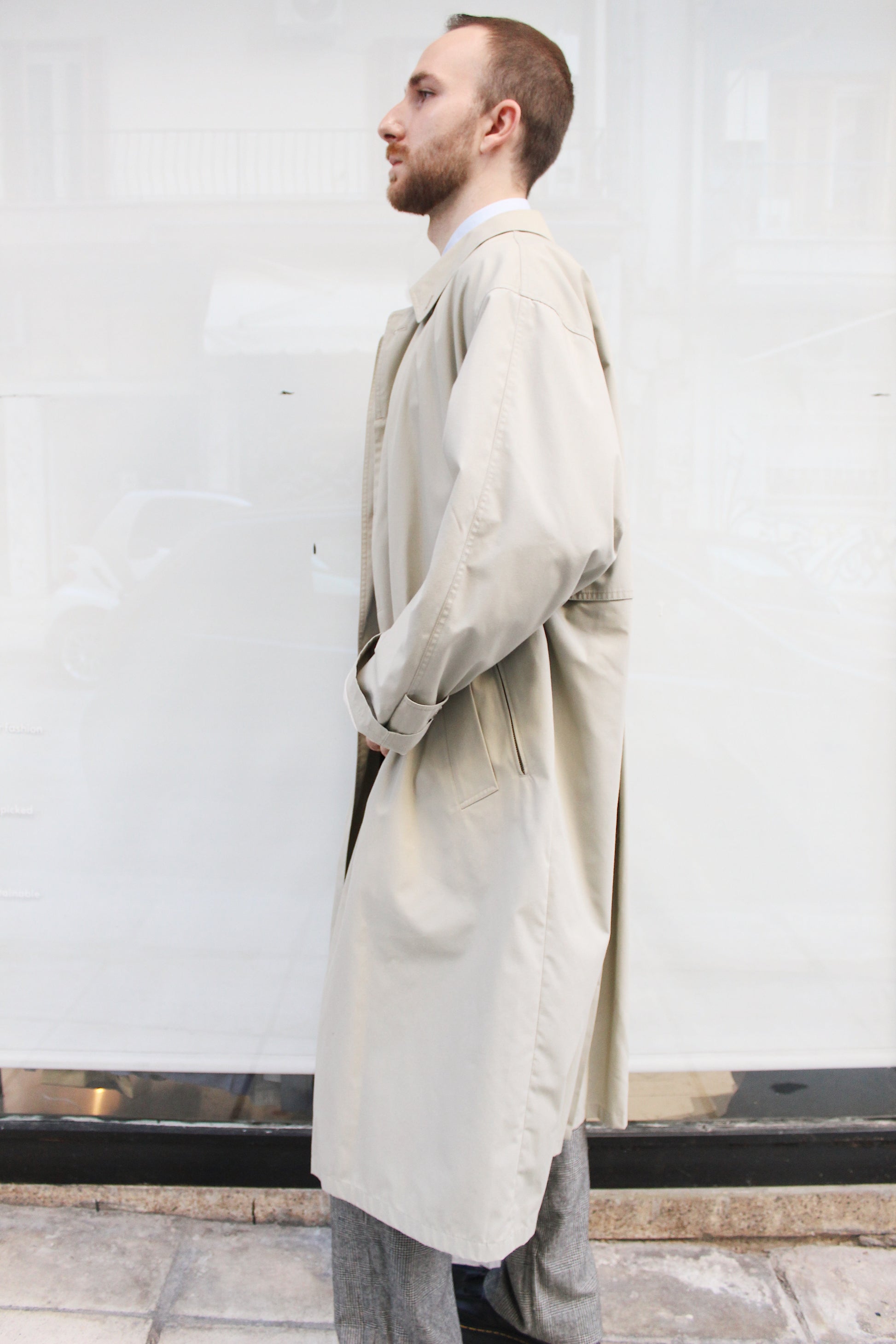 Bugatti trench coat σε κλασσική γραμμή. Χαρακτηριστικός μικρός γιακάς εποχής 1980. . Εσωτερικές και εξωτερικές τσέπες.