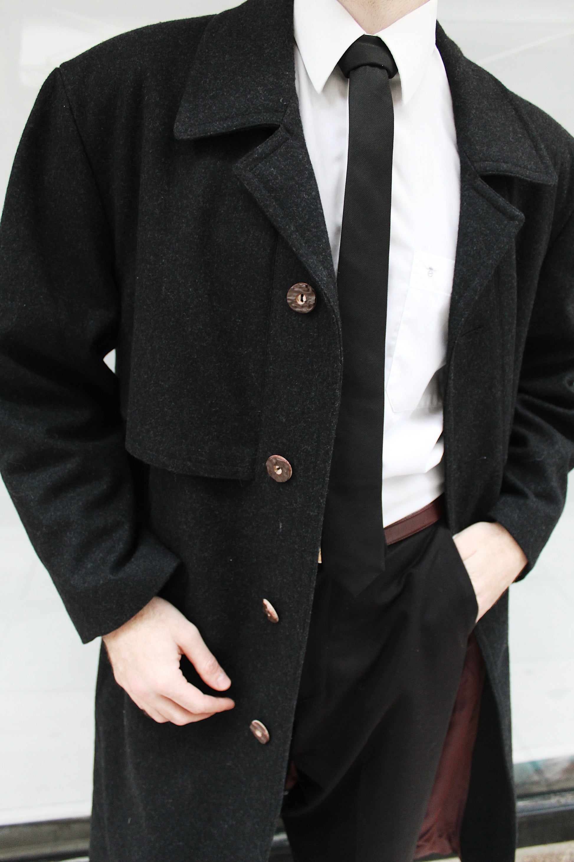 Αυστριακό μαύρο παλτό σε oversized γραμμή. Μικρός γιακάς. Εσωτερικές και εξωτερικές τσέπες. Χαρακτηριστικά κουμπιά