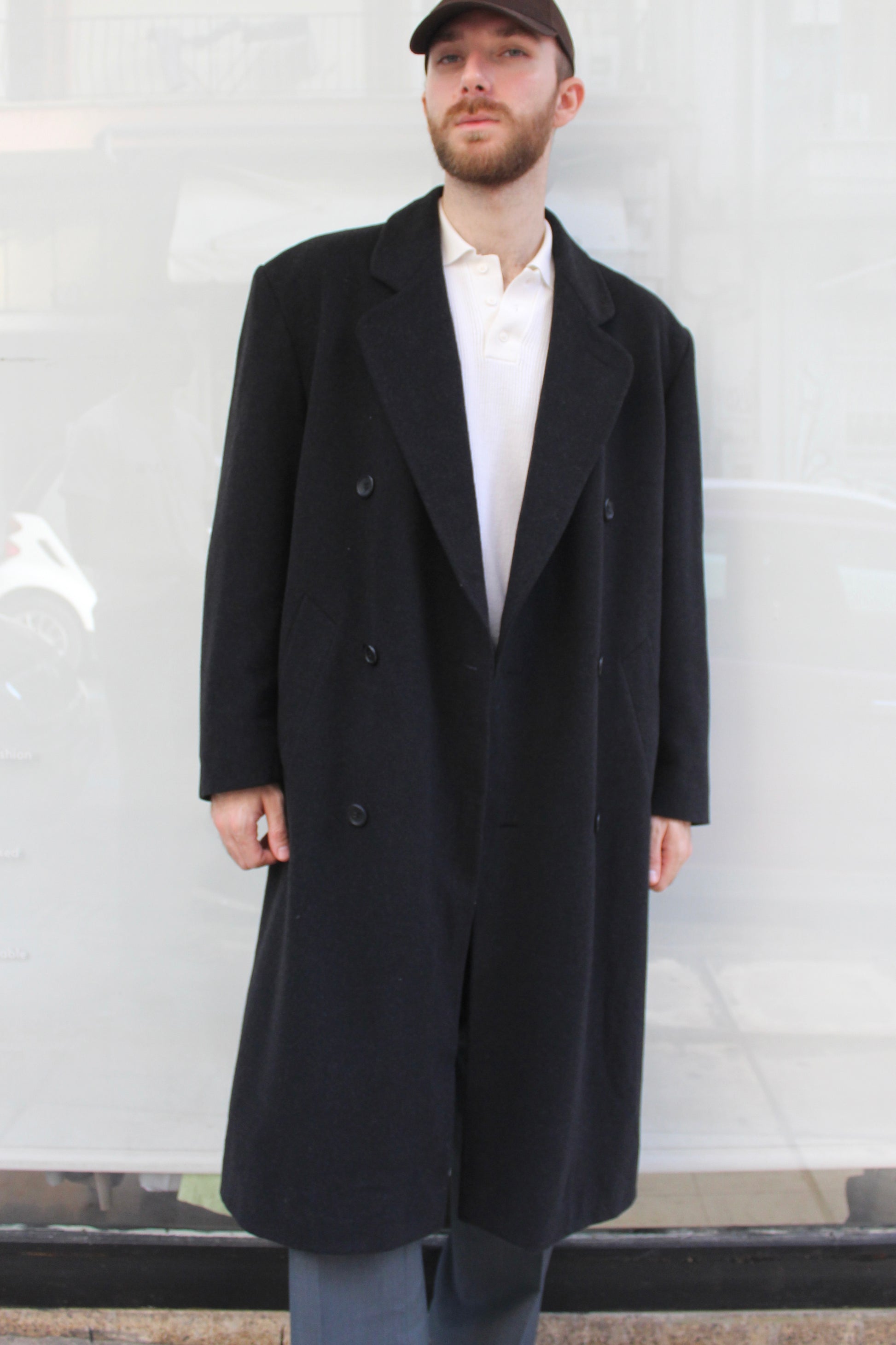 Maxi overcoat σε σκούρο σταχτί γρκι σε 80's γραμμή από 100% παρθένο μαλλί. Γιακάς rounded. Εσωτερικές και εξωτερικές τσέπες. Ζώνη μέσης