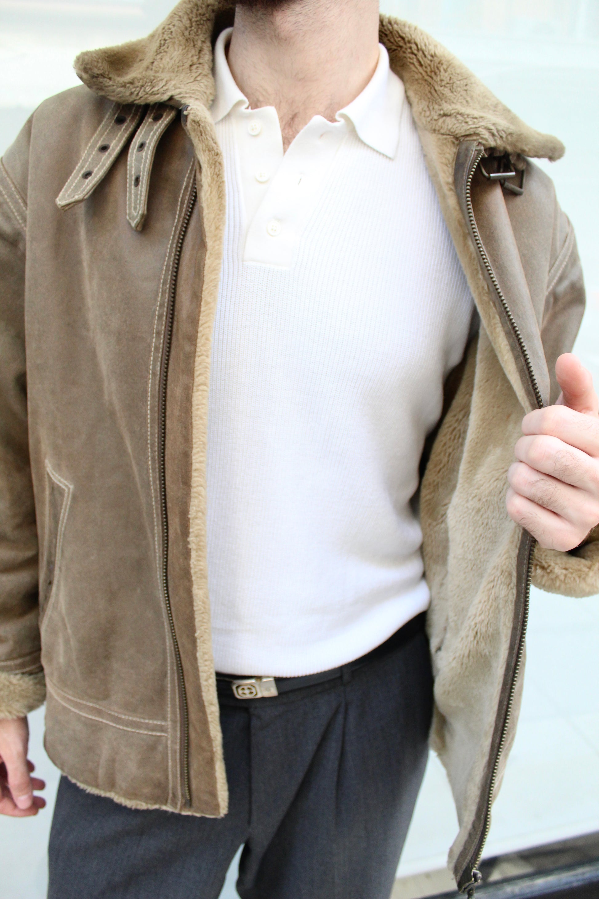 Δερμάτινο shearling jacket σε ταμπά χρωματισμό. Εσωτερική επένδυση συνθετικής γούνας. Turtleneck λαιμόκοψη με ζωνάρια.