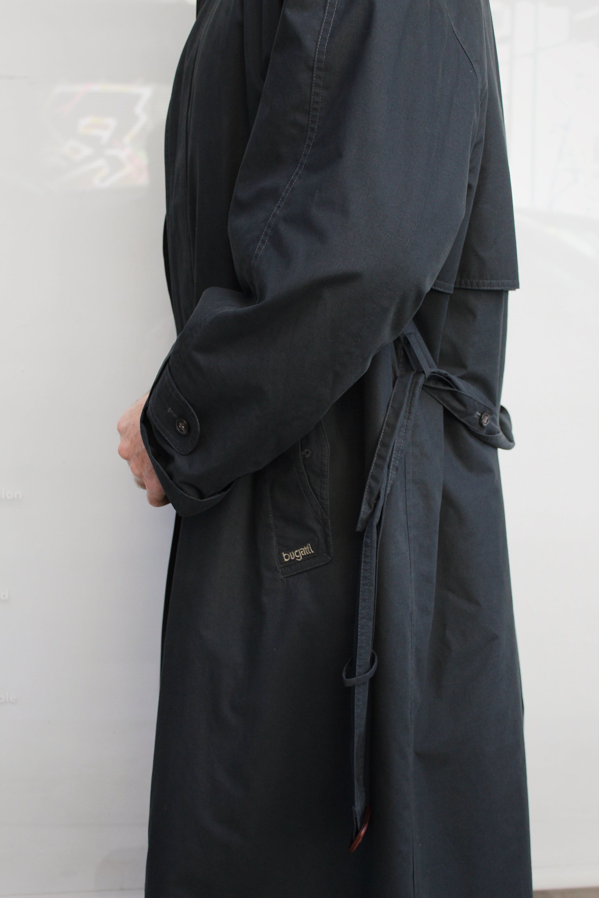 Bugatti trench coat σε κλασσική γραμμή. Χαρακτηριστικός μικρός γιακάς εποχής 1980. Μάλλινη αποσπόμενη επένδυση. Εσωτερικές και εξωτερικές τσέπες.