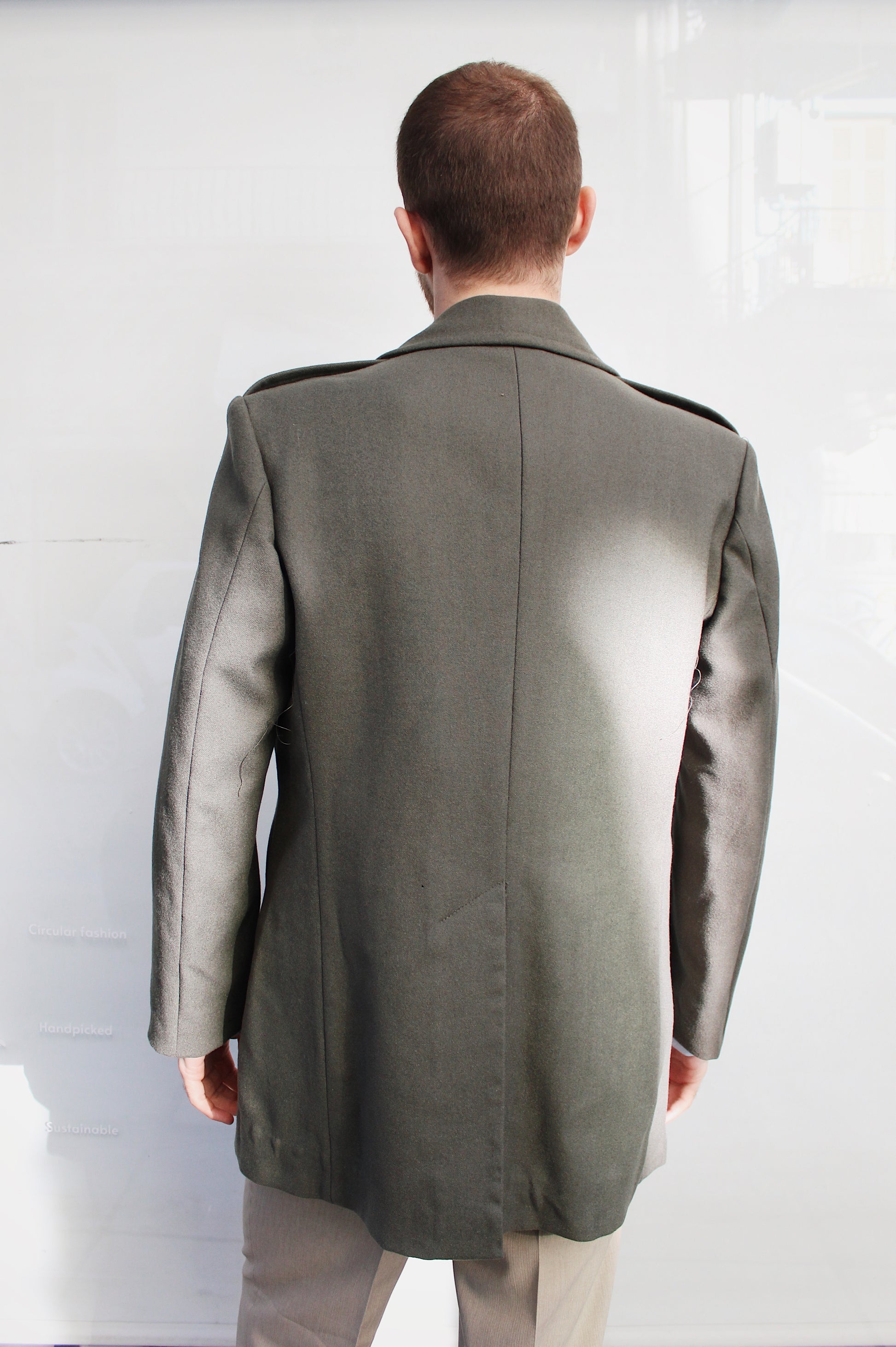 Στρατιοτικό midi παλτό σε κλασσική γραμμή. Σταυροτό κούμπομα. Εσωτερικές και εξωτερικές τσέπες.