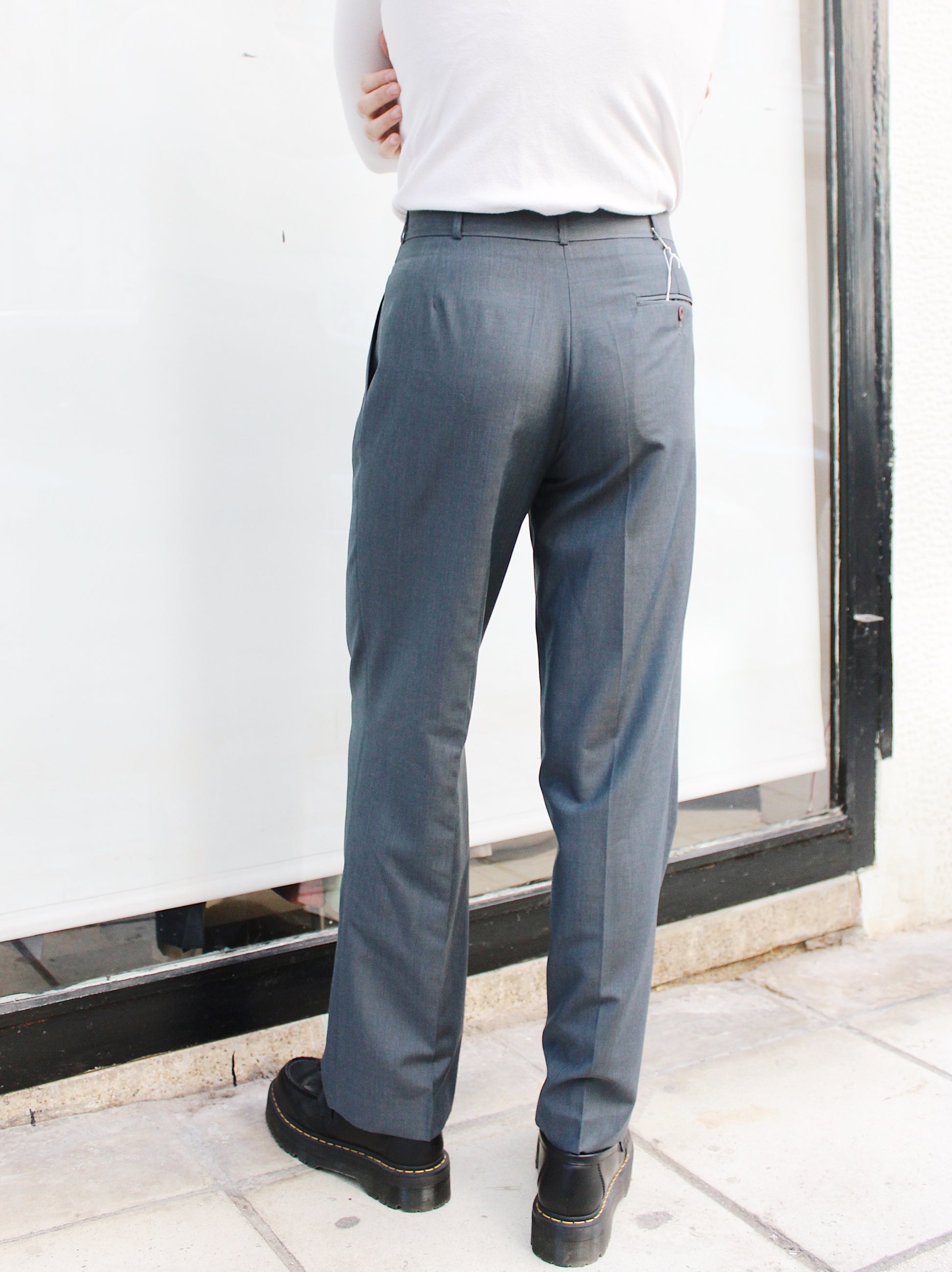 Deadstock παντελόνι σε κλασσική retro γραμμή του 1990 από 100% cool-wool. Μέση με λεπτομέρειες με 2 πιέτε μπροστά. Κλείσιμο μπροστά με φερμουάρ και κρυφή μεταλλική κόπιτσα.