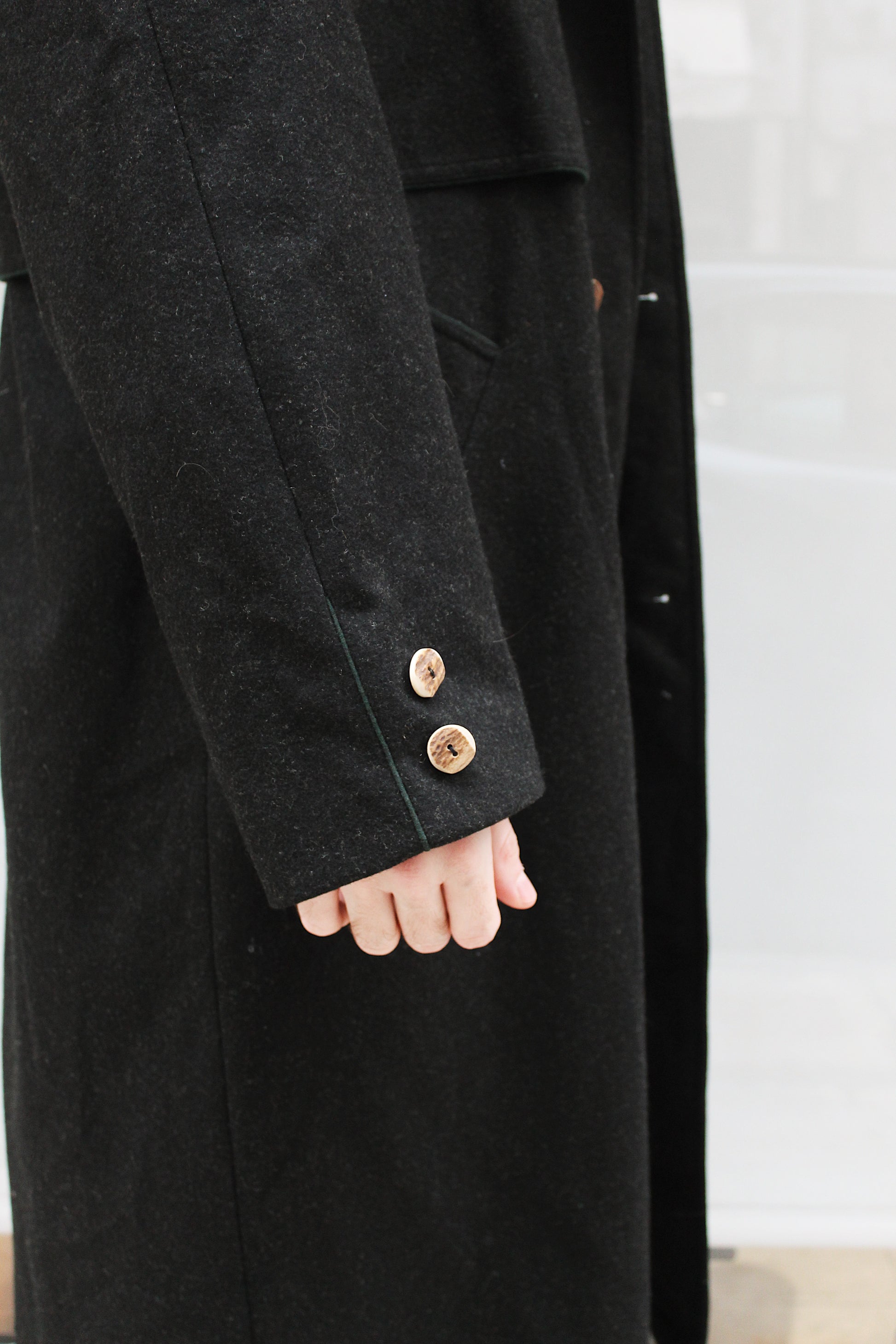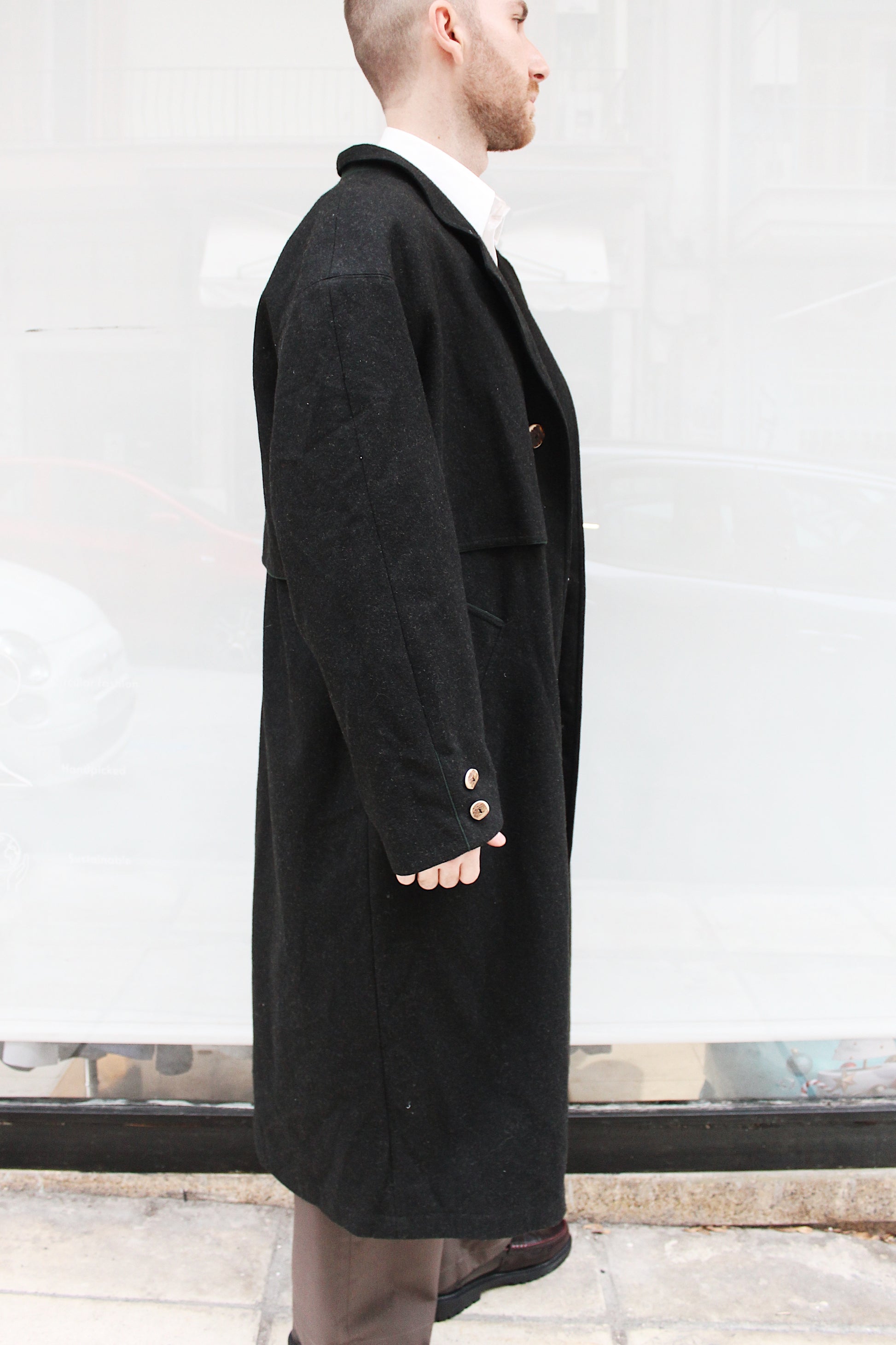 Αυστριακό σκούρο γκρί παλτό. Μικρός γιακάς. Χαρακτηριστικό πέτο στη πλάτη.