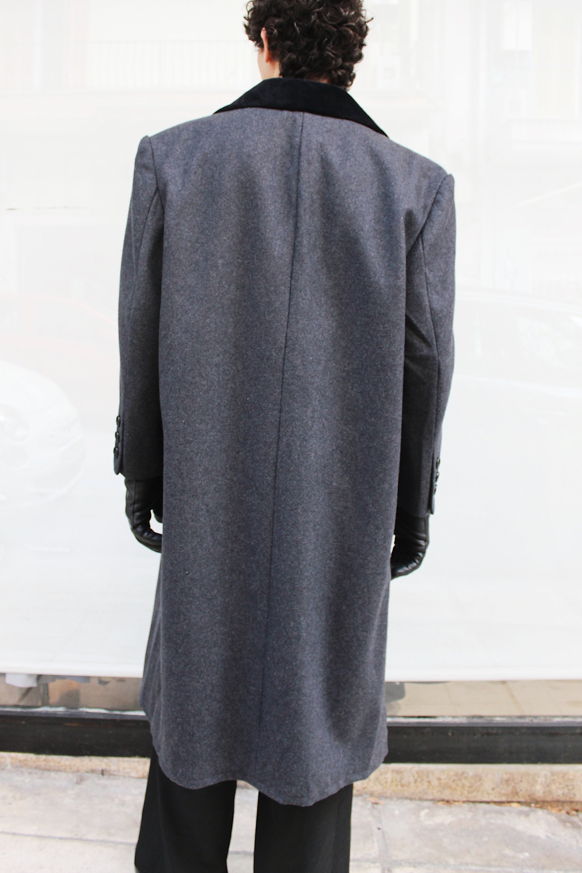 Maxi gray παλτό σε αυστηρή ίσια γραμμή. Χαρακτηριστικός rounded γιακάς με λεπτομέρειες από βελούδο. Σταυρωτό κούμπομα. Εσωτερικές και εξωτερικές τσέπες