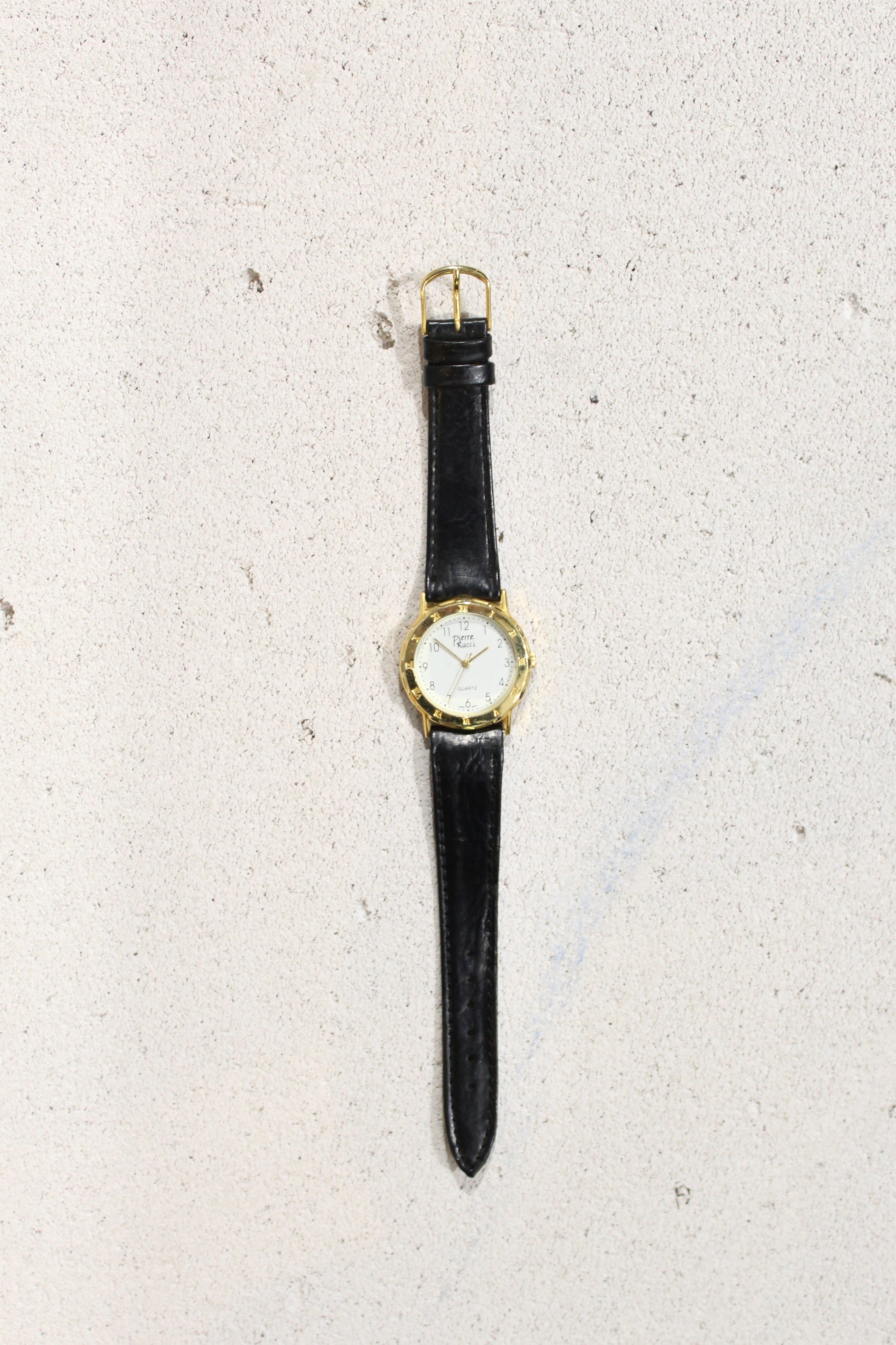Pierre Rucci δεκαετίας 1990 αναλογικό ρολόι με δερμάτινο λουράκι. Κάσα μεγέθους <30mm. Στρόγγυλο τζάμι. Λειτουργικό