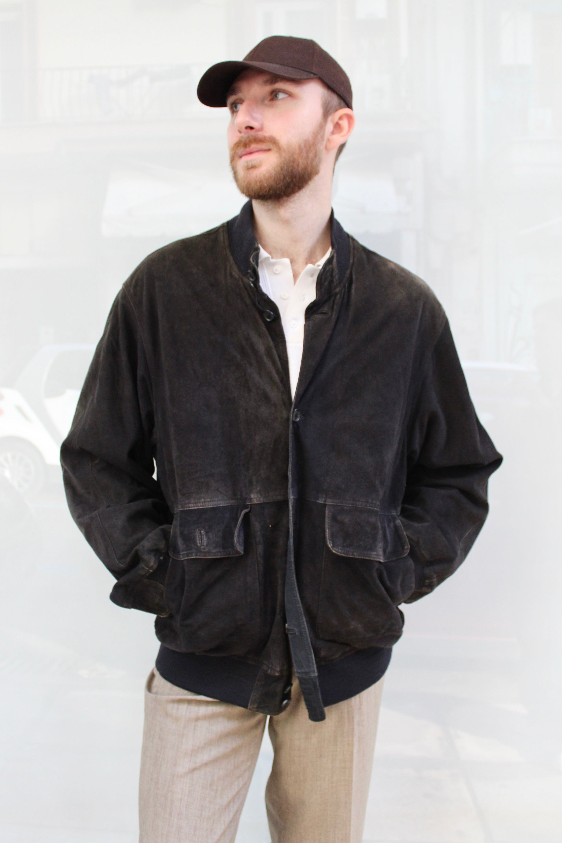 Bomber 90's κλασική γραμμή. Μαύρο σταχτί χρωματισμός. Κατασκευασμένο 100% real suede leather. Πολλαπλές τσέπες εξωτερικά.